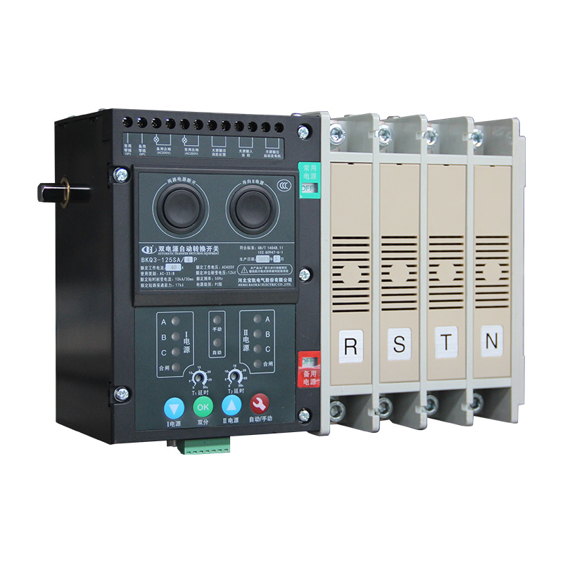 BKQ3-SA/S系列三段位PC级双电源自动转换开关电器适用于交流400V及以下,额定频率50Hz,额定工作电流20A-630A的双路配电系统中。本产品主要用于国家规定的一级负荷,广泛适用于消防、邮电通讯、医院、宾馆、城市轨道交通、高层楼宇、工业流水线、等需要连续供电的重要场所。主、备电源可以是电网电源、自启动发电机组等。产品符合 GB/T 14048.11《低压开关设备和控制设备 第 6-1 部分:多功能电器 转换开关电器》。